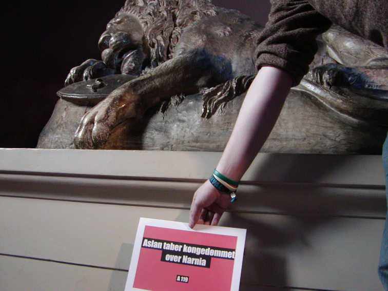 Elevens kommentarDen forstende løve i Thorvaldsens “Schweizerløven” har jeg relateret til Fantasi værket Narnia af C.S Lewis og fremstilt den som Løvekongen Aslan som langt om længe blev besejret af den onde Isdronning og derved forstenet til evid tid. |